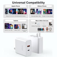 Fast charging made easy: The USB C Wall Charger features a dual-port design with both USB-C and USB-A, allowing you to charge two devices simultaneously without compromising speed or performance. Its compact cube design is perfect for tight spaces or portability. Compatible with a variety of devices including iPhone, iPad, AirPods, Android phones, Switch, Google Nexus, and more, it supports USB-C Power Delivery to ensure your devices charge quickly, especially when you're in a rush!
