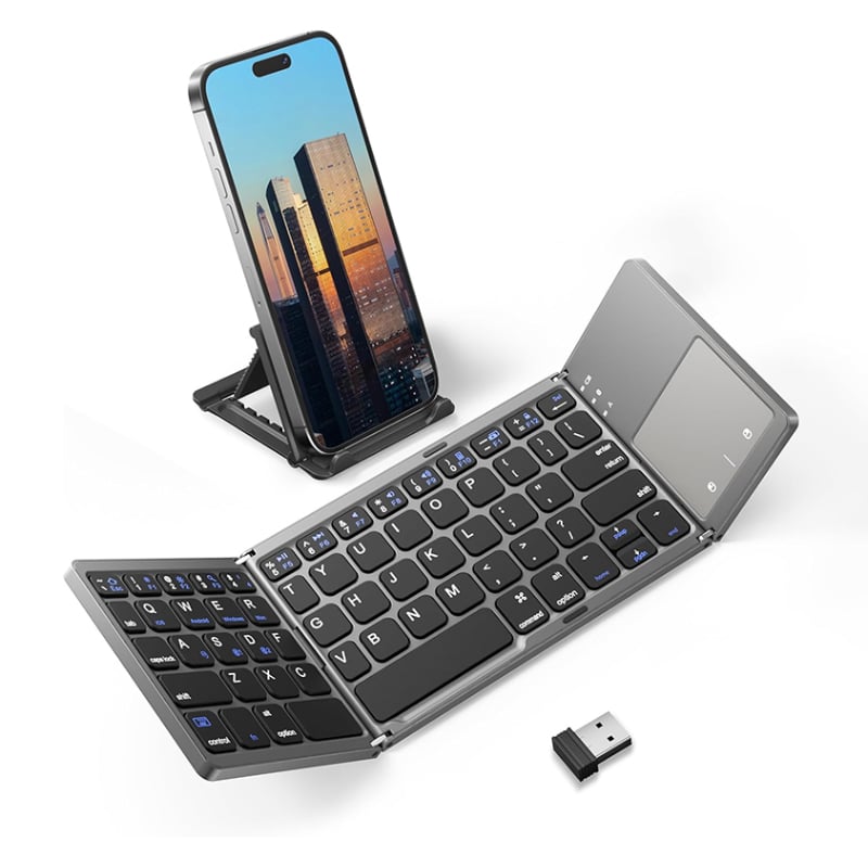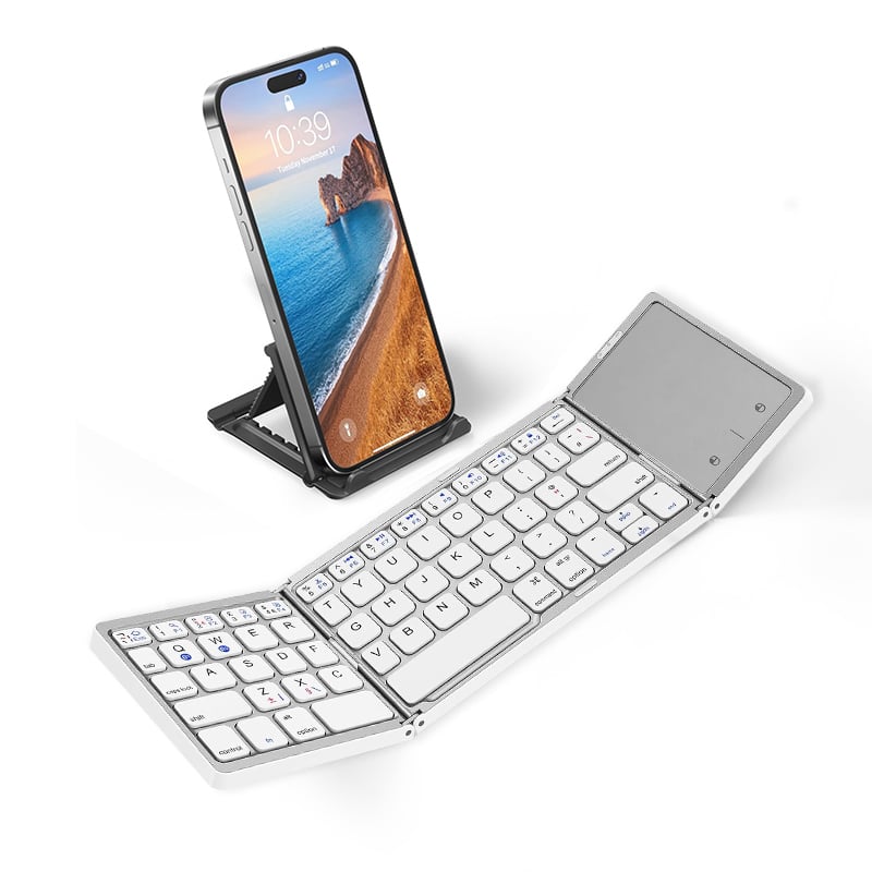 Key Features: The touchpad supports iOS gestures, providing you with a MacBook-like experience. The silent keys are perfect for quiet environments. Equipped with Bluetooth 5.1 for fast and stable connections. The built-in magnetic stand makes it more convenient to use with smartphones and tablets. Compact and lightweight, it easily fits into your bag for on-the-go use!
