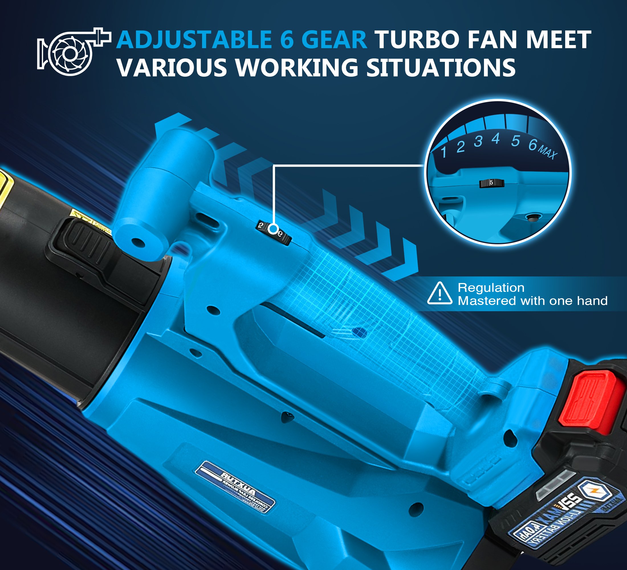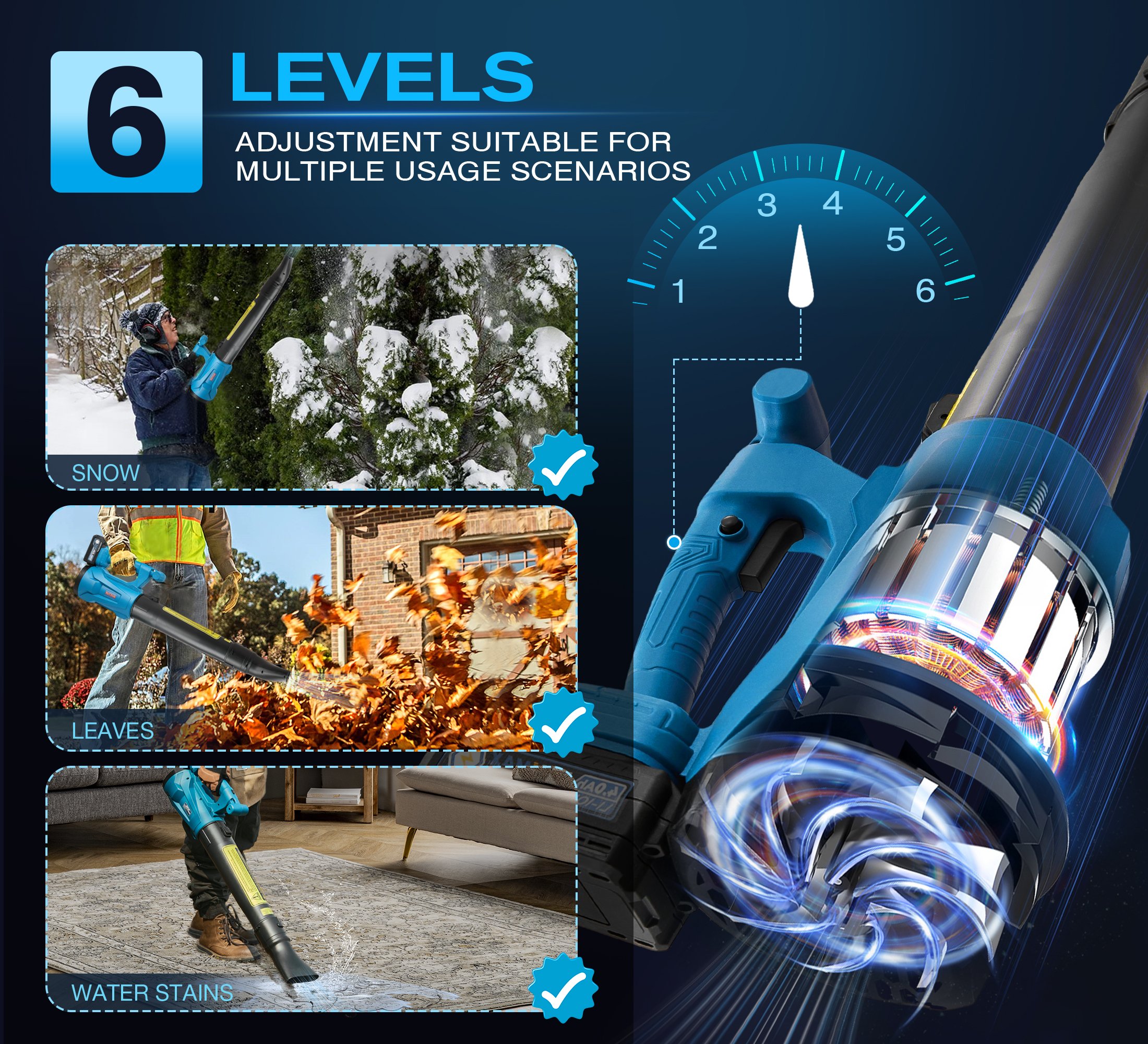 SIX-SPEED ADJUSTMENT: Powerful Motor With a motor that delivers up to 120MPH and 350CFM air output, this cordless leaf blower provides the perfect balance of power and efficiency for all your leaf-blowing needs.