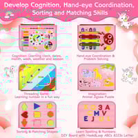- Play while learning: Keep your baby entertained while they develop essential skills like dressing at their own pace, improving fine motor skills and finger dexterity. The Octopus button page help improve hand eye coordination. Clock, calendar and season weather page is for cognitive skill. Shape matching page and fun jigsaw puzzle improve recognition and imagination. Toddler can learn spelling and numbers through the hook&loop letters board and interesting number threading game.