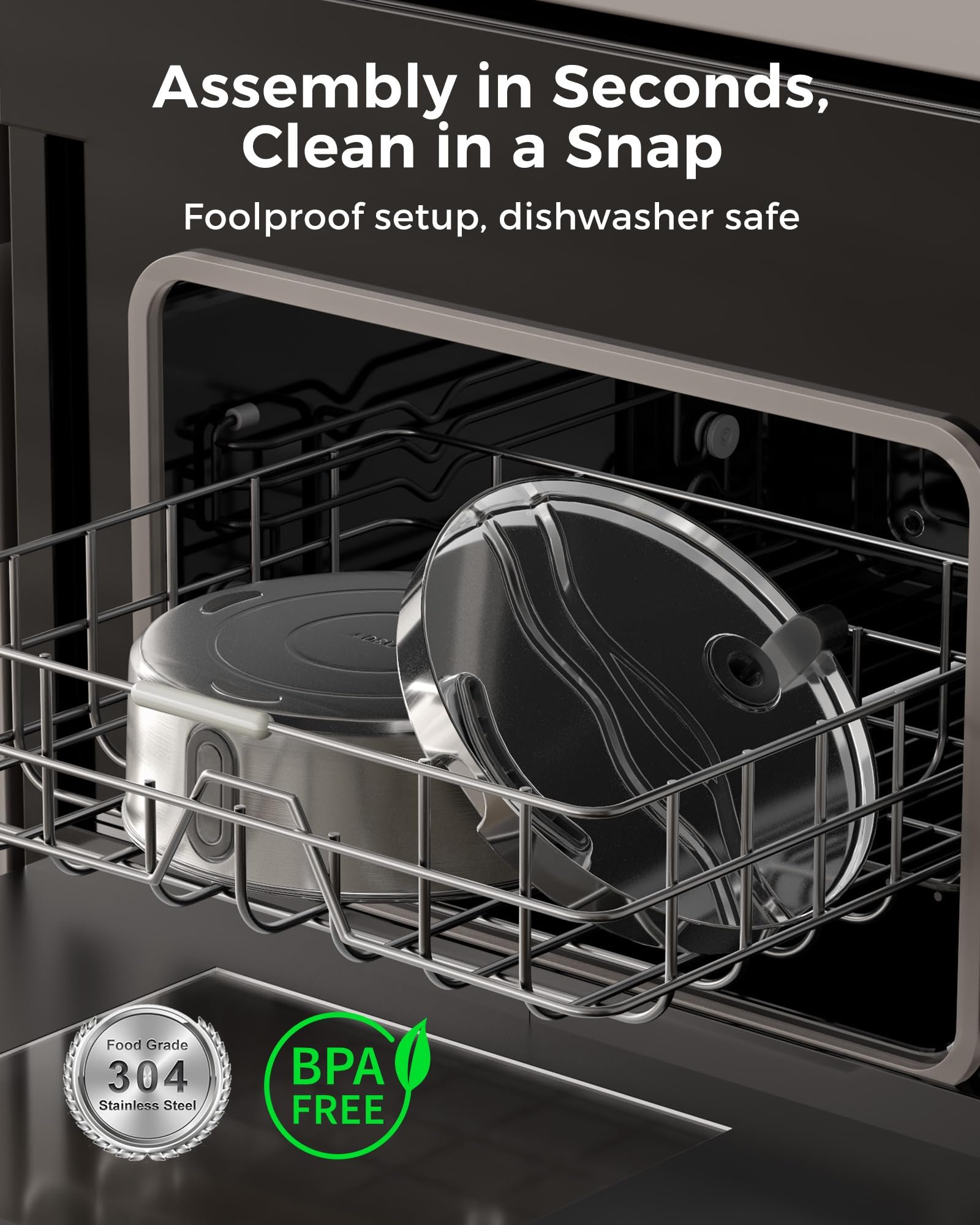 Easy maintenance: Tool-free assembly in 30 seconds and durable stainless steel construction make cleaning effortless.