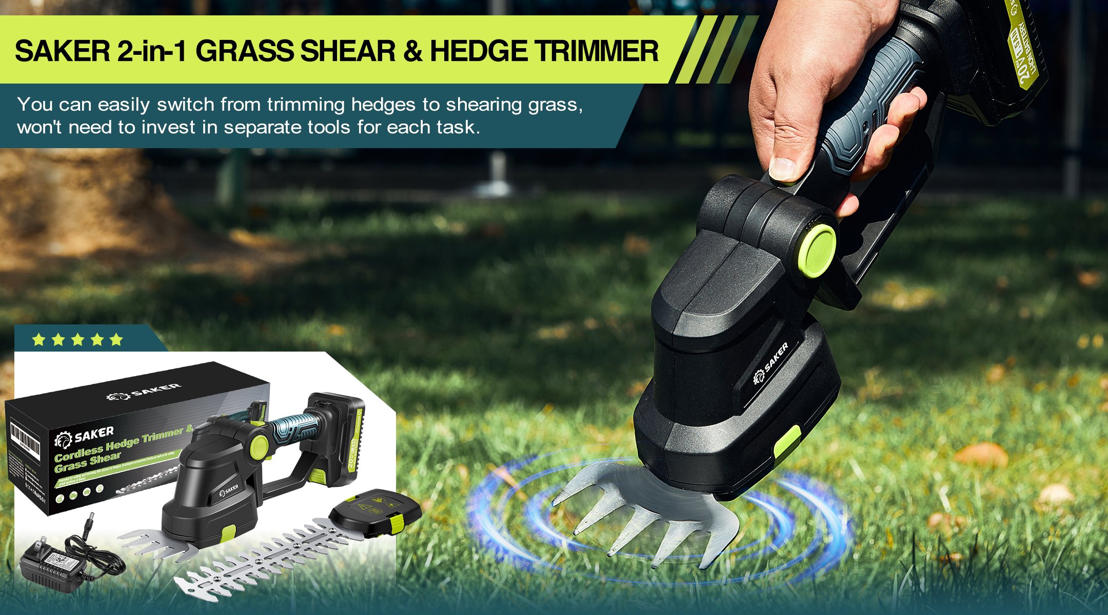 This trimmer has 2 types of heads and the cutter heads are easy to switch. The hedge clippers are for shrubs, and the lawn clippers work well in hard-to-reach areas like corners and stone paths.