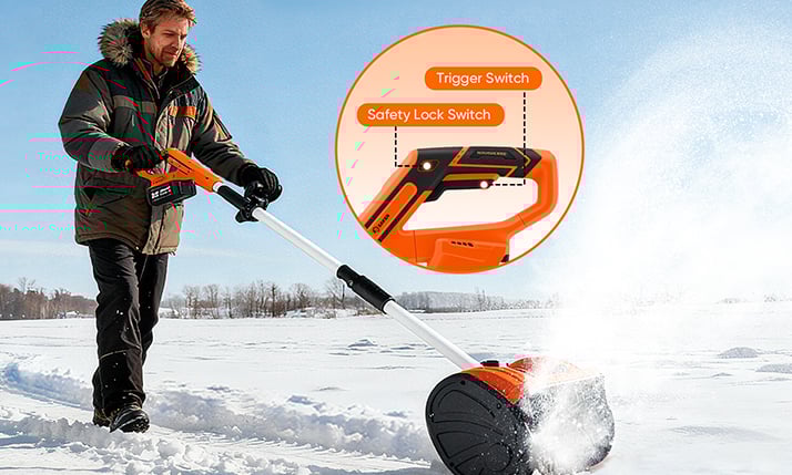 A safety-lock + trigger helps prevent accidental starts, while the ≈11.9 lb build and glove-friendly grip make it easy to handle. Best for light-to-moderate, powdery snow on smooth surfaces.