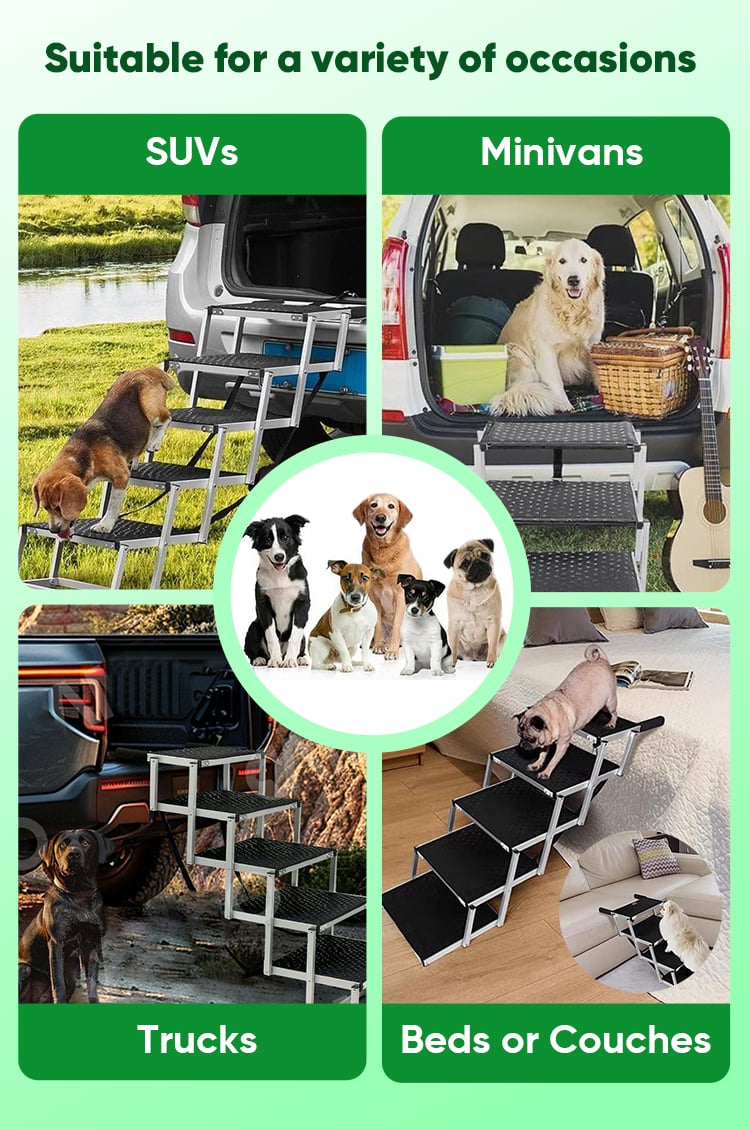 Our versatile dog car ramp is suitable for cars, SUVs, minivans, trucks, beds, and even sofas. It's adjustable to fit a wide range of heights and lengths.