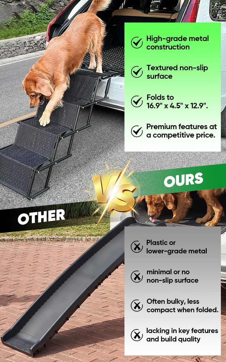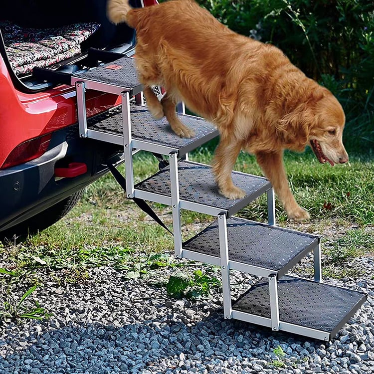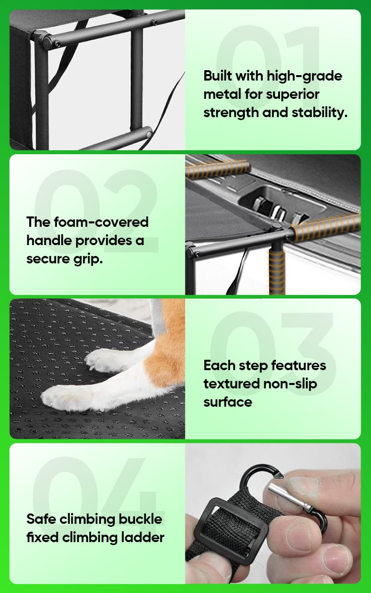Our dog car ramp is constructed with high-grade metal and is designed to safely support pets weighing up to 200 lbs (90 kg).