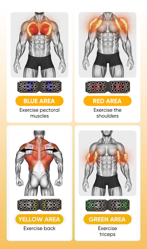 Simply follow the color-coded system, place your hands on the corresponding areas, and perform regular push-ups. Each color represents a different muscle group, helping you target specific areas for more effective training.