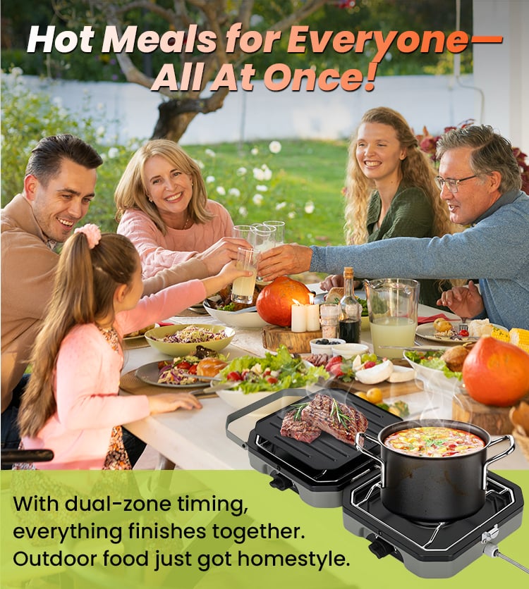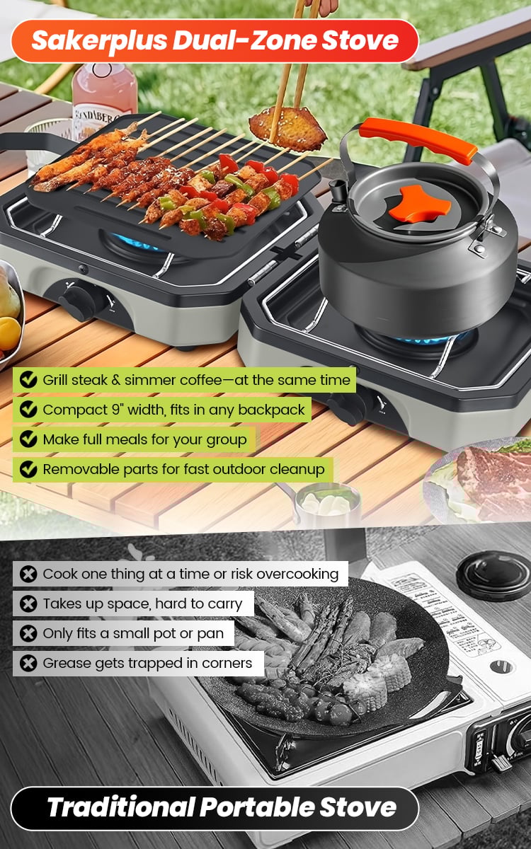 Cook breakfast and boil coffee side-by-side, or grill steaks while simmering sauce—Sakerplus's Independent Dual-Zone System lets you prepare complete meals all at once, just like at home.