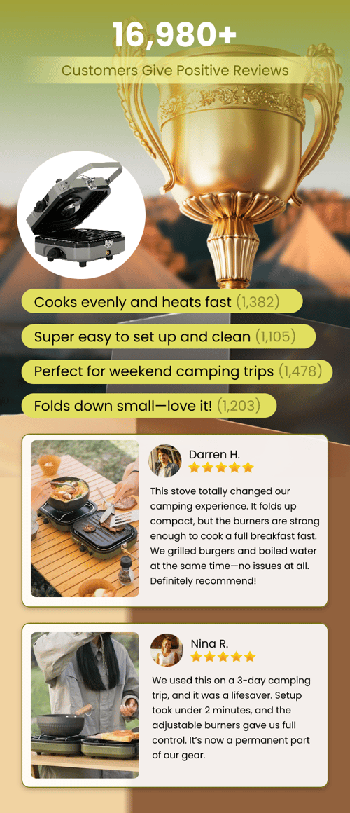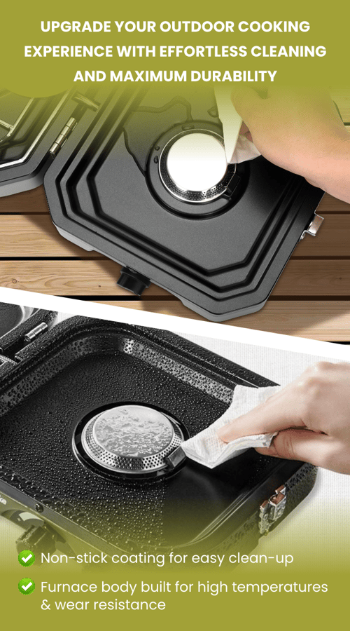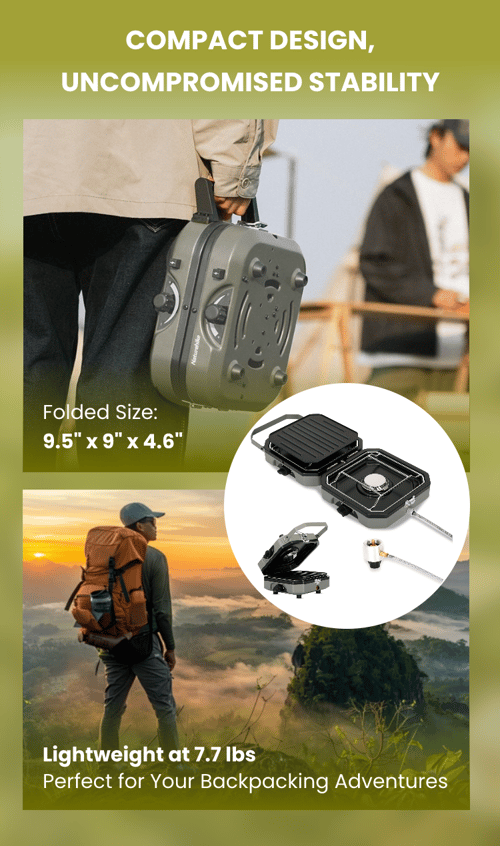 Absolutely! When folded, the stove is just 9 inches wide and weighs only 7.7 lbs. It’s compact enough to fit in a backpack or car trunk, making it perfect for camping, tailgating, or weekend getaways.