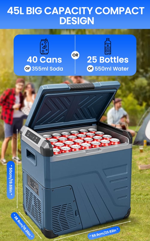 It can hold up to 40 cans of 355ml soda or 25 bottles of 550ml water — plenty of space for road trips, camping, or a day at the park.