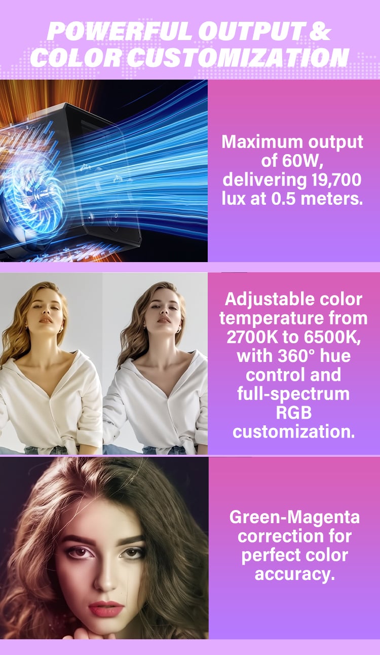 Absolutely. It features 0%–100% brightness adjustment, 2700K–6500K color temperature control, 360° RGB hue, and GM (Green-Magenta) correction.