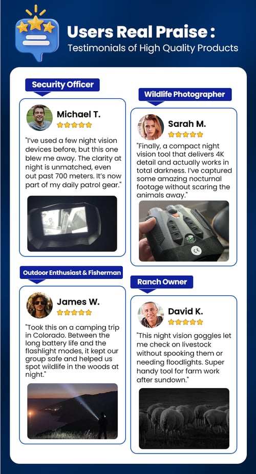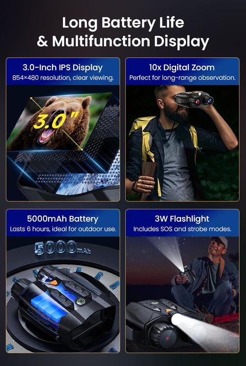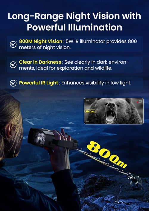 Used it for camping and night hikes — absolutely love how far it can see! The built-in flashlight and night vision give a huge sense of security.