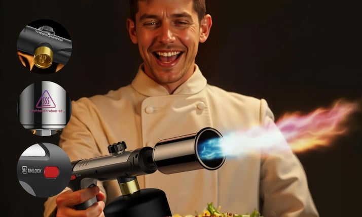 Features a triple safety guard—heat-sensitive nozzle, secure gas seal to prevent leaks, plus safety lock to block accidental max flame use.