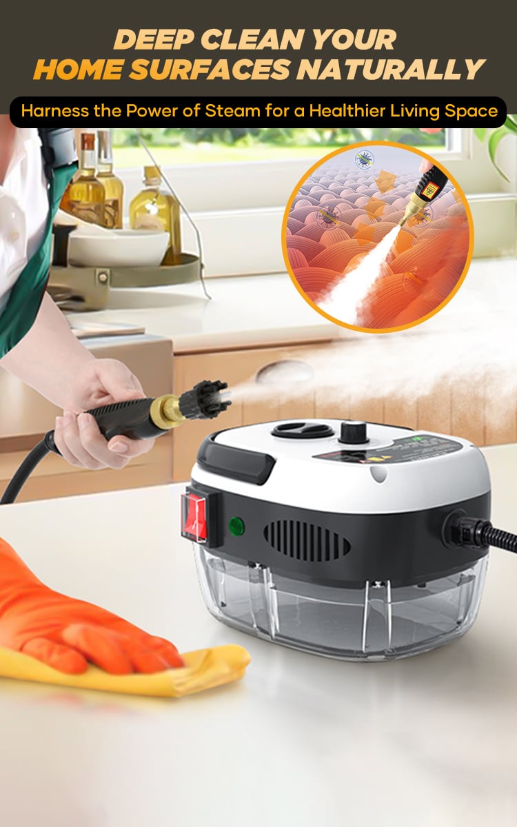 The device heats water to produce steam and releases it under pressure through a nozzle. The heat and pressure help loosen grime, kill germs, and dissolve stubborn residues, making cleaning faster and more hygienic.