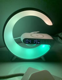 A G-shaped LED wireless charging speaker with fast charging, immersive sound, ambient light, and a built-in alarm clock.